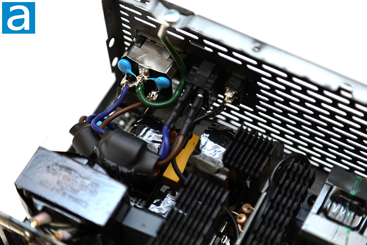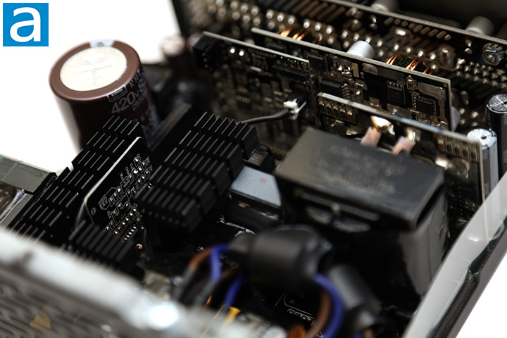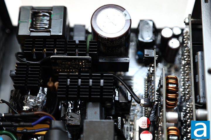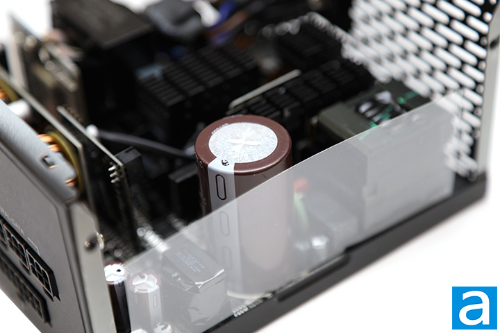 On the primary side, we can see one Japanese brand Nippon Chemi-Con capacitor. 100% Japanese brand capacitors are specified on the marketing material, so this is to be expected. Our 1000W version of Thermaltake's latest Toughpower GF3 series power supply incorporates one 820µF x 420V capacitor. It is rated at 105c, whereas more value-oriented power supplies usually use 85c rated capacitors.
