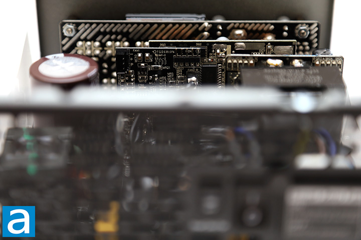 At the back, we have a large daughterboard covering the majority of the rear panel for the modular cable sockets. All modular sockets at the bottom are soldered directly to the main PCB after the secondary stage. Pin headers join the mainboard and daughterboard to reduce power transmission loss. The output connector configuration can be seen on the previous page. Overall, the internal build quality of Thermaltake's Toughpower GF3 1000W power supply is very good -- something we would expect from a CWT-built unit. Components are arranged very well for optimal cooling with almost no wires running around inside, and solder points on its black/green PCB is quite clean in general. I would say the Thermaltake Toughpower GF3 1000W is generally very good with regards to the selection of components used under the hood.
