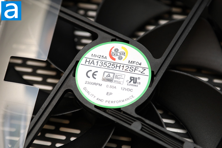 Lastly, we see a 135mm fan that provides cooling to the Thermaltake Toughpower GF3 1000W's internal components. This fan is slightly smaller than the Toughpower GF1's 140mm fan. It is connected to an add-in board using a 3-pin connector. A 135mm fan is about the largest you can fit in a power supply with a bottom mounted fan, and if not a lot of heat is being generated, noise will be kept to a minimum. The model of the fan is Hong Hua HA13525H12SF-Z, as shown in our photo above. The HA13525H12SF-Z is a fluid dynamic bearing fan specified at 0.50A for a maximum speed of 2300 RPM. The fan is not supposed to activate until the PSU is loaded to approximately 300W with Smart Zero Fan active. As such, it should remain off for the most part, and even when it is on, the fan speed will vary with load. Fans with fluid dynamic bearings generally have much longer lifespans compared to sleeve bearing fans, and is quite suitable for this application.
