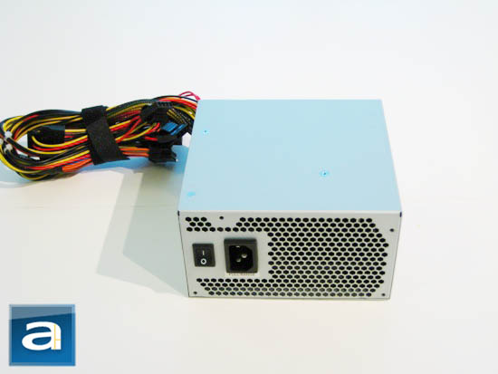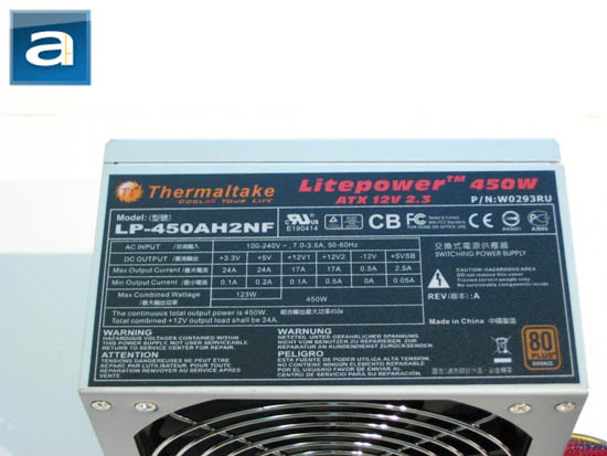 A honeycomb mesh is used all over the rear of the Thermaltake Litepower 450W power supply; except for the power switch and power input adapter -- which is located near the left side of the back. Similar to all newer power supplies, this features an automatic full range (100V-240V) AC line voltage selection, which automatically detects the voltage from your AC outlet for use in differing countries that incorporates different outlet voltages.