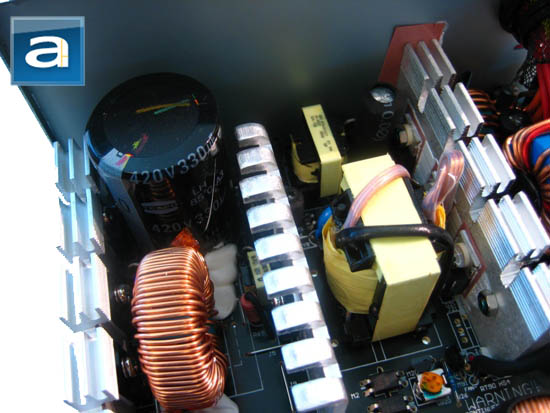After unscrewing four screws, including the one with the warranty seal, the internals of the Thermaltake Litepower 450W are revealed. A quick note to mention is that opening your power supply as we have done here will inevitably void your warranty.