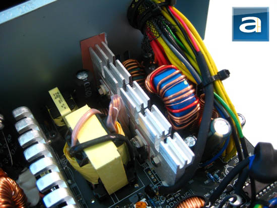 There are three small aluminum heatsinks that are used to dissipate heat away from its internal components. These heatsinks are spaced pretty far apart allowing to provides lots of room for air to move around in the PSU itself, although this reduces contact area for heat dissipation.