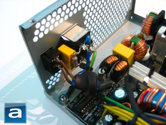 As seen in the photo above, the electronics component board is actually quite a bit than the enclosure as evident from its distance to the rear mesh -- this will help distribute heat exhaust better. The board is positioned towards the back of the power supply itself, and explains the location of the fan as mentioned on the previous page.