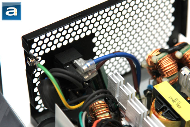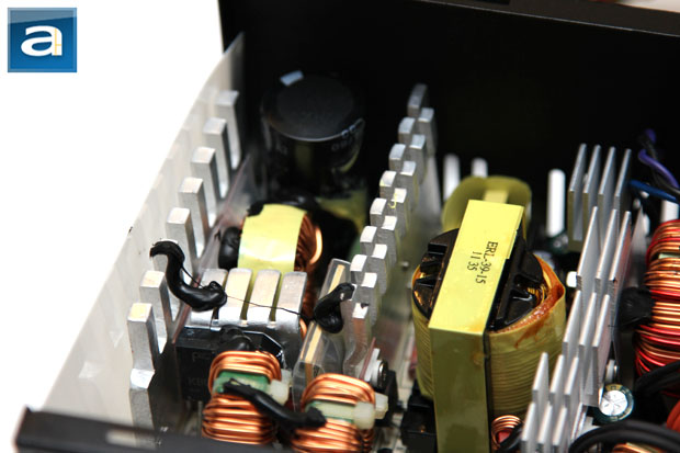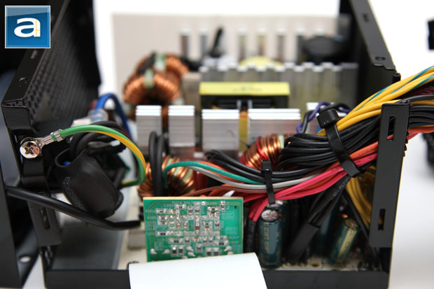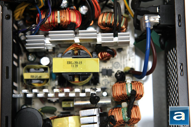 Disassembling the Thermaltake SMART 630W is pretty straightforward, but with a few tricks in between. With two screws at the top, in order to get the shell off the frame, you will need to take out an additional three screws on the side -- two of which are hidden behind the label on the right. Built by HEC/Compucase, our photo above shows an overhead view of the its internal components. At first glance, the build quality appears to be acceptable, but definitely not great -- the soldering job has some room for improvement. Although it is fairly tightly packed inside, the components are well organized for optimal cooling and reduced heat congestion. There are mid-sized three heatsinks inside the power supply, with all of them finned at the top, as you can see in our photo above.