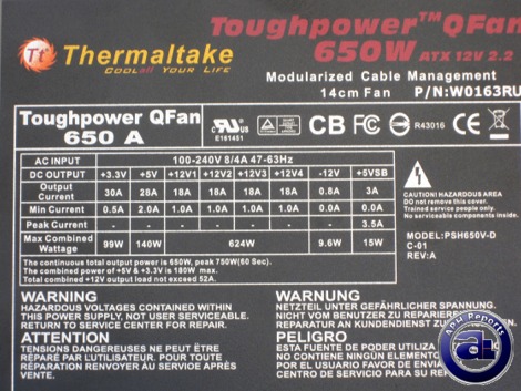 The DC power output table is placed at the top of the unit. The maximum combined power output, as rated by the manufacturer, is 650W continuous (As suggested by the model of this power supply, heh) and 750W burst over 60 seconds. That's plenty of overhead; as some computers may require more power during its initial boot -- for example, hard drives take a lot more power to start than they are in their constant running state. That said, the Thermaltake Toughpower Cable Management 650W is capable of pushing 30A (99W) out its +3.3V rail, 28A at +5V (140W), and total of 624W combined maximum from its virtual quad +12V (18A maximum each for combined 52A). The maximum combined output for the +3.3V and +5V rail is 180W. Again, the maximum continuous output is 650W in total.