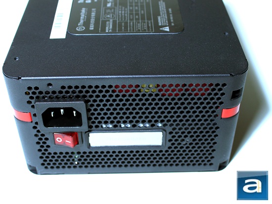 The Thermaltake Toughpower Grand 750W uses the typical matte black finish with a red strip around the power supply located approximately one-third of its total height from the top; which I find quite unique compared to most power supplies I have seen. On the back side, we are presented with a familiar honeycomb mesh with its on/off switch just beneath the male connector for power input. The on/off switch will light up when it is turned on. Additionally, Thermaltake tacks on an extra feature. Right next to the on/off switch, we can see a slim silver-colored bar. When the power supply is active, the word "Thermaltake" lights up in this location. This is one feature that I found quite intriguing, especially considering the fact no one really pays attention to this area.