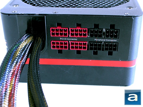The Thermaltake Toughpower Grand 750W has an extra plastic cover with an O-shaped opening for hardwired cables. As mentioned on the previous page, the Toughpower Grand 750W comes with three hardwired cables; with more than sufficient modular cables provided. The hardwired cables include the 24-pin motherboard connector, 4+4-pin EPS/ATX 12V connector, and 8-pin EPS 12V connector. All hardwired cables are 55cm in length. There are two 2x2 matrices of modular connectors adjacent to each other; one set is provided for the 6-pin peripheral connectors, and the other set for the 8-pin PCI-e connectors. Each of these are easily and securely connected when needed, as well as being very easy to detach. Generally speaking, this is more than enough to power up multiple drives and accessories attached to most enthusiast builds.