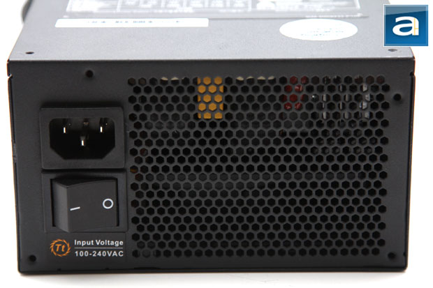 Starting from the back part of the power supply, we have the same familiar honeycomb mesh design like most PSUs with bottom mounted fans; and the standard on/off switch located below the male connector for power input on the western edge. In other words, the Russian look is out, and now we are back to the Euro-American design. The low resistance honeycomb mesh design is implemented to maximize airflow and minimize air resistance. This is done as heat needs to leave the power supply as easily and efficiently as possible, because the Thermaltake Toughpower XT Platinum 1275W incorporates only one 140mm fan at the bottom, with no auxiliary fans. This is not to mention it will need to deliver up to 500W without any active cooling. I think this design is generally efficient for the most part, but the extra space around the AC power input and switch is probably not necessary; also, no one really needs a power switch of that size anyway. That aside, as with most new power supplies, the Thermaltake Toughpower XT Platinum 1275W has an automatic full range (100V-240V) AC line voltage selection, so the user does not have to worry about manually selecting input voltage.