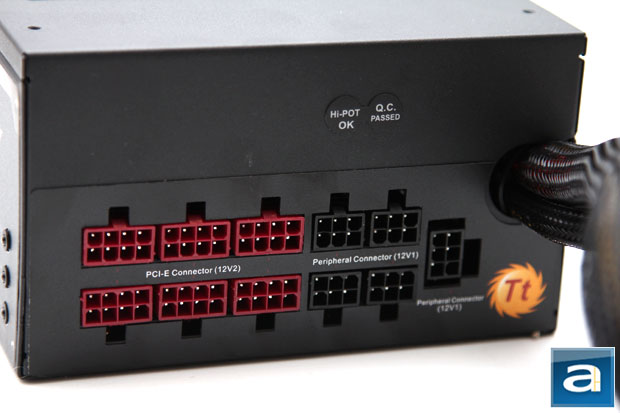 The rear cable connection panel is done nicely. Like the Toughpower Grand, the Toughpower XT Platinum sticks closely to the "keep it simple, stupid" principle. From the left in our photo above, as the label suggests, we have six 8-pin sockets for PCI Express cables, followed by five 6-pin sockets for SATA and/or Molex connectors (Dependent on the attached cable). Incompatible outputs will not physically fit into each other, so I think Thermaltake has done a great job in this regard. This simple array of available connectors should be more than sufficient for casual users and power enthusiasts alike.