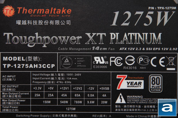 The voltage specification label at the top of the Thermaltake Toughpower XT Platinum 1275W. There are three main virtual rails. Up to 25A can be delivered via the +3.3V rail for a total of 82.5W; while 25A on the +5V rail brings the output to 125W in this area. The total combined output for the +3.3V and +5V rail is 150W. In other words, your power allocation combination must fall within the limits of the listed specifications. Meanwhile, two +12V rails delivers up to 45A (540W) and 65A (780W), respectively. If you do a quick calculation, this makes it 1320W. Obviously, the combined power output for the whole Toughpower XT Platinum is 1275W, so this configuration negates a little bit of overhead associated with multi-rail designs. Again, your power distribution in your system must fall within the limits provided -- it must not exceed 82.5W on the +3.3V rail, 125W on the +5V rail and 150W combined for both, 540W and 780W on the two respective +12V rails, and 1275W combined between the +12V and +3.3/+5V rails. It does sound a bit confusing to understand how this works at first, but generally speaking, this configuration allows fairly flexible power demands and should be sufficient to accommodate most users. On the other hand, I have seen lower wattage PSUs with more power on the +5V rail, so I would actually expect a little more in this area for a 1275W power supply unit.