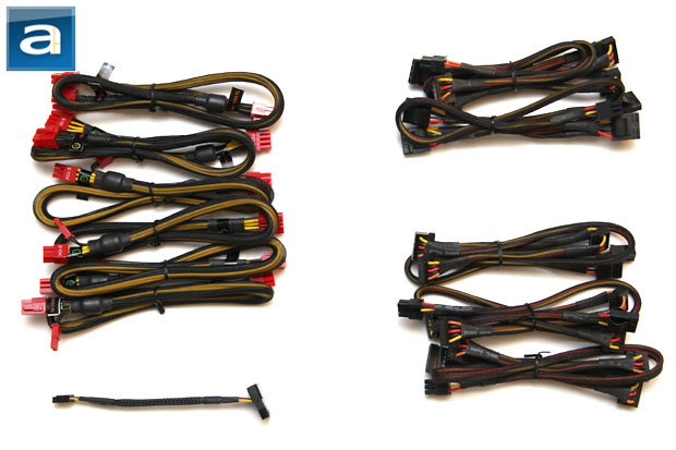 A total of eleven modular cables are included out of the box. All modular cables are sleeved and easy to bend, making them extremely easy to work with. As I was digging through the wire labels on the ATX 24-pin cable, I noticed something very weird: It says "22 AWG". I don't think I have seen anything this thin on a power supply before; a closer inspection indicates it is just the signal wire -- the rest are all 16 AWG. 16 AWG wires are found in the PCI Express, ATX 4+4pin, and EPS 8-pin cables as well. Everything else is 18 AWG, which is standard, and to be expected.