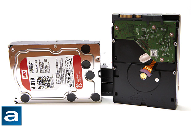 The third contestant on our list, by alphabetical order, is the Western Digital Red WD40EFRX 4TB. It is based off the Western Digital Green series drives, with changes made to the hardware and firmware to make it NAS optimized. This includes reliability enhancements with what Western Digital calls the "3D Active Balance Plus", which refers to the disk being physically balanced properly to reduce excessive vibration and noise in a multi-drive configuration, as well as TLER support, just like the ST4000VN000. This 5,400 RPM drive spins the slowest of the group, but it has four high density 1TB platters inside to work out the difference. It comes with a 3-year warranty, and retails for about $180 at press time.