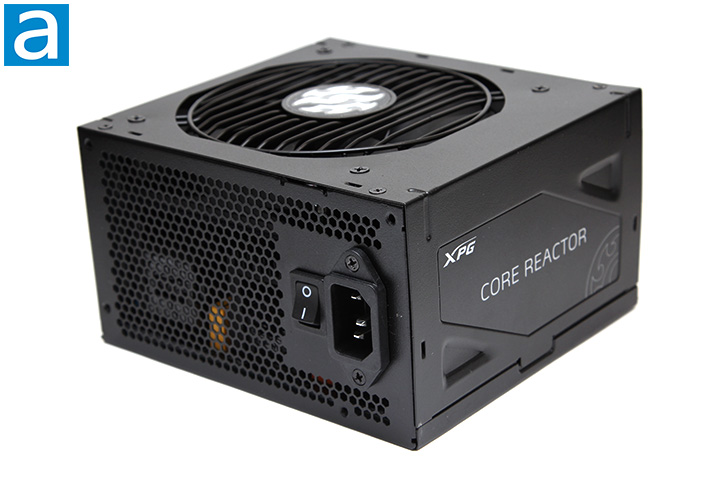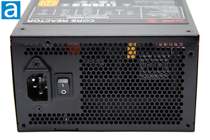 Starting from the back part of the power supply, we have the same familiar honeycomb mesh design as most PSUs with bottom mounted fan; what you will find here is a vertically aligned male connector for power input on the western edge along with an on/off switch next to it. The low resistance mesh design is implemented to maximize airflow and minimize air resistance. This is done as heat needs to leave the power supply as easily and efficiently as possible, because the Core Reactor 750W incorporates only one 120mm fan at the bottom. It is also implemented in a reasonably efficient manner as the power input connector and switch took up a relatively small amount of room at the back. As with all active PFC power supplies, the XPG Core Reactor 750W has an automatic full range 100V-240V AC line voltage selection, so the user does not have to worry about manually selecting input voltage.