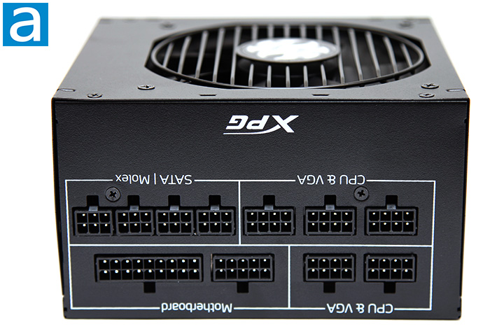 The rear cable connection panel is done nicely. Similar connectors are grouped together and are laid out in a very logical manner. To ensure you know what is going on, they are all grouped and clearly labeled for minimal ambiguity. From the left to right and top to bottom, we have two ATX/EPS 4+4 pin or PCI Express, motherboard 24-pin, three more ATX/EPS 4+4 pin or PCI Express, and four Molex/SATA headers. The motherboard section supports an ATX 24-pin connector by two separate blocks next to each other. Incompatible outputs will not physically fit into each other, so I think XPG has done a great job in this regard. This is a reasonable array of outputs in correspondence to the number of connectors on each modular cable, which should be sufficient for casual users and power enthusiasts alike.
