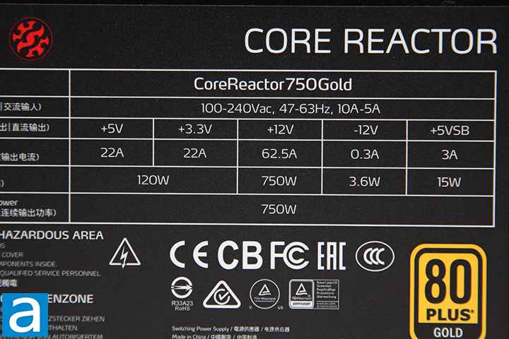 The XPG Core Reactor 750W is 80 Plus Gold certified, which means that it is certified to be at least 87%, 90%, 87% efficient at 20%, 50%, and 100% load, respectively. Higher certifications available for power supplies of this type include 80 Plus Platinum and 80 Plus Titanium at press time.