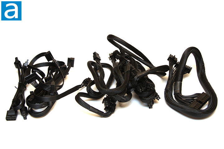 A total of eleven modular power cables are included out of the box. The ATX 20+4-pin, both ATX 4+4-pin, and all four PCI Express cables are sleeved, while the SATA and Molex cables are flat. All wires are unmarked, but from my visual inspection, 16 AWG wires are found on the ATX 20+4-pin, ATX/EPS 4+4-pin, and PCIe 6+2 pin bundles. All peripheral cables appear to be 18 AWG, which is standard and to be expected.