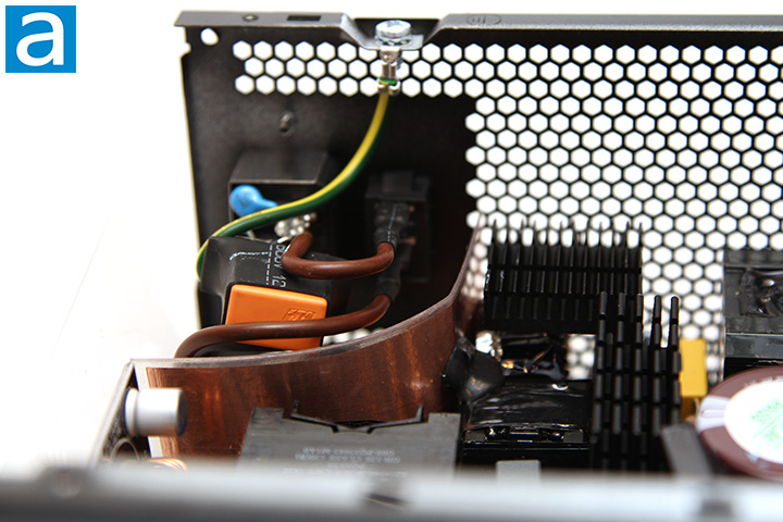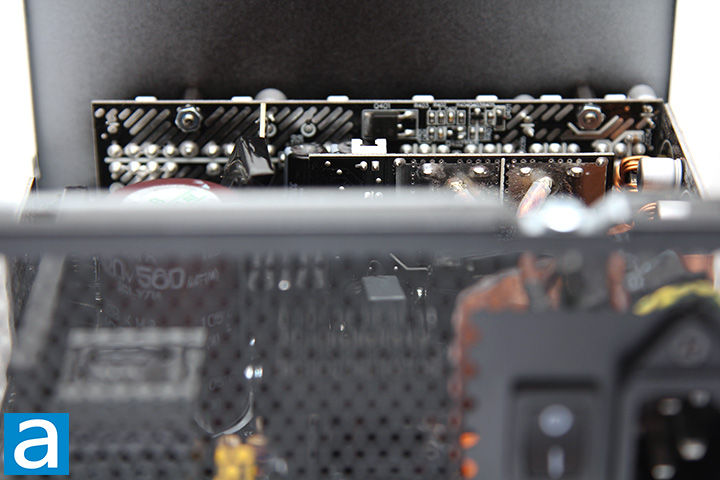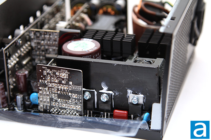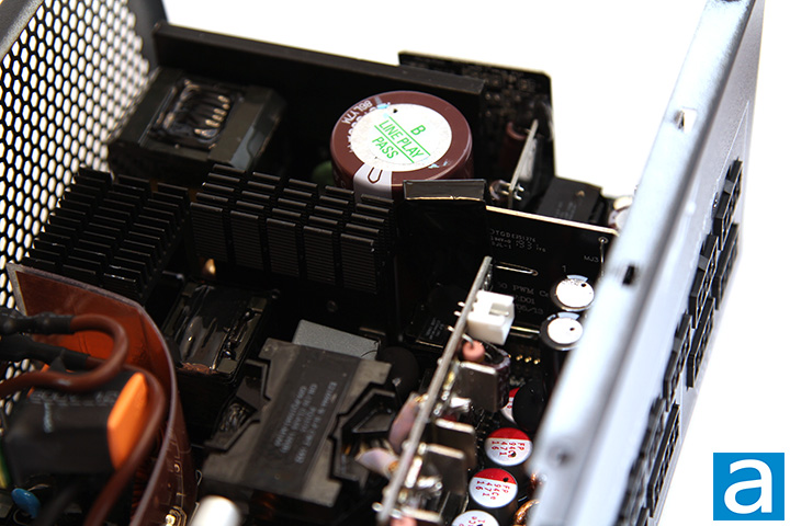 On the primary side, we can see one Japanese brand Nippon Chemi-Con capacitor. 100% Japanese brand capacitors are specified on the marketing material, so this is to be expected. Our 750W version of XPG's Core Reactor power supply incorporates one 560µF x 420V capacitor. It is rated at 105c; whereas more value-oriented power supplies usually use 85c rated capacitors.