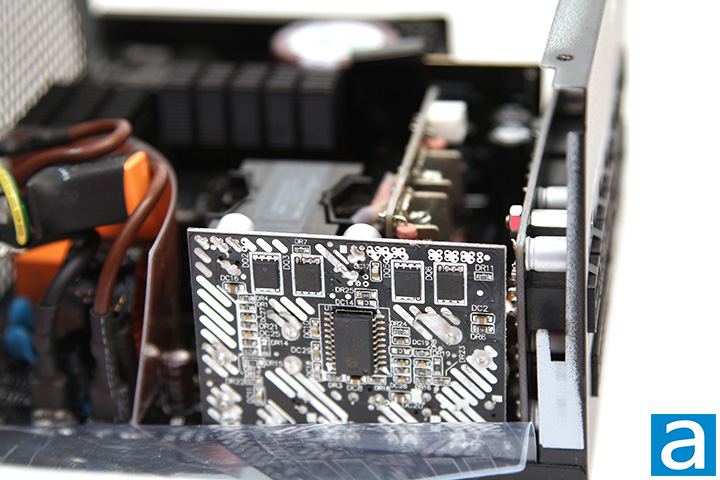 On the secondary side, we can see more Japanese brand capacitors rated at 105c. As with modern high efficiency power supplies, all rectifiers produce the +12V out, while the +5V and +3.3V outputs are generated from the +12V output using a DC to DC converter within the power supply unit. Six ON Semiconductor NTMFS5C430N MOSFETs are responsible for generating the +12V output, located on yet another add-in board. The NTMFS5C430N's rated continuous drain current is 131A at 100c. It has an RDS(on) value of 0.0017 ohm maximum and 0.0014 ohm typical. Two UBIQ Semiconductor QM3054M6 MOSFETs and two UBIQ Semiconductor QN3107M6N MOSFETs on an add-in board generate the +5V and +3.3V output from the +12V rail. The QM3054M6's rated continuous drain current is 61A at 100c. It has an RDS(on) value of 0.0048 ohm maximum and 0.0038 ohm typical. The QN3107M6N's rated continuous drain current is 74A at 100c. It has an RDS(on) value of 0.0026 ohm maximum and 0.0021 ohm typical. ANPEC's APW7159C is the PWM switching controller. The datasheets for all components mentioned in this review can be found on their respective manufacturer's websites.