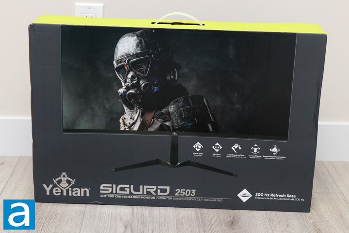 The retail box of the Yeyian Sigurd Series 2503 is pretty similar to the Agile NL, at least in its color scheme. For one, the Sigurd Series 2503 also has a gray box with a neon green-yellow border around it. The monitor can be found in the middle of the box with several features highlighted underneath. These features include its 1920x1080 resolution, 23.8" size, 1ms response time, curved display, and adaptive sync capabilities. The company logo and product name are printed at the bottom of the box, while a description of "23.8" FHD Curved Gaming Monitor" can be found in both English and Spanish. Finally, to the side is the impressive 200Hz refresh rate capability, although we will explore these features later in our report. Around the box we have several more features and specifications highlighted to explain the product more.