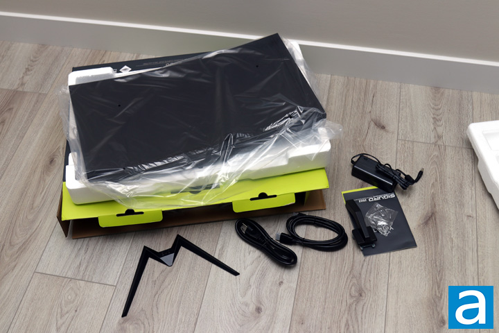 Out of the box, we have the Yeyian Sigurd Series 2503 in a plastic bag and sandwiched between two foam brackets. The accessories can be found seated in a pocket of one of the foam brackets, each wrapped in their own plastic bag. This includes the stand, AC power cable, external power supply, HDMI cable, and a small bit of documentation for setting up the Sigurd Series 2503. There is not much else to look at here, so let us continue in our inspections.