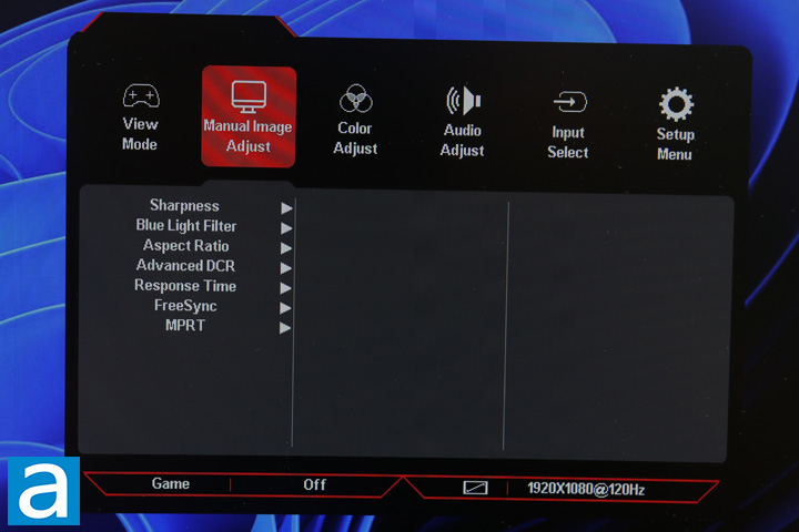 The on-screen display menu of the Yeyian Sigurd Series 2503 can be accessed by pressing the top button at the back of the monitor. The OSD menu is pretty straightforward, and it looks very familiar to the one on my ViewSonic display, albeit with a red and black color scheme. The first tab called View Mode, which primarily affects the color profiles for the monitor. This includes several profiles as you can see. Next, we have a tab labeled "Manual Image Adjust". Different settings, like changing sharpness, dynamic contrast ratio, changing response times, and enabling FreeSync or MPRT.