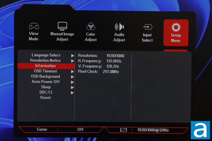 Under "Color Adjust", you can change more standard things like contrast, brightness, color temperature with preset settings, color range, and an item called HDRShow. Enabling this, however, negatively affected the color output, even when trying to enable HDR in Windows, so I ended up leaving it as is. The "Audio Adjust" menu is where you can change the volume or mute the internal speakers in the Yeyian Sigurd Series 2503. "Input Select" lets you choose between the inputs to display on the monitor. Finally, "Setup Menu" is where you can change the on-screen display menu settings as well as other operation settings. Finally, you can fully reset all of your changes in the monitor here.