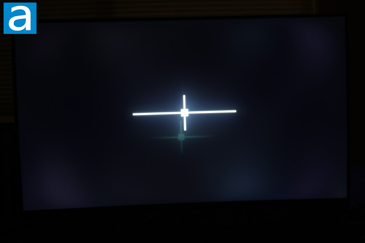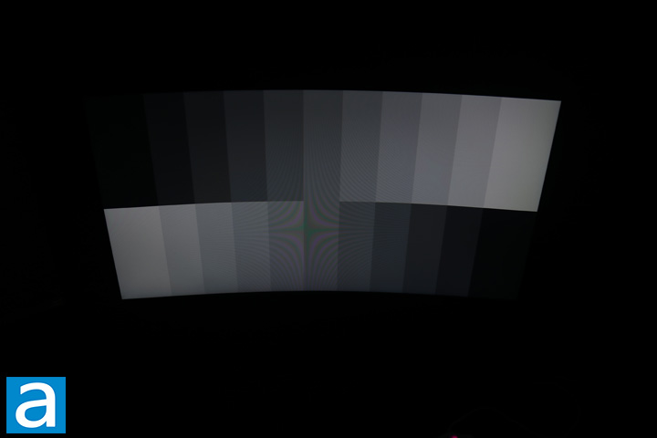When testing for uniformity, our first test is the black uniformity check. This checks for backlight bleeding, which is more common with IPS panels, although it also is seen on any LED-backlit panel. This photo was taken with a F-stop of 4.0, shutter speed of 1 second, and ISO at 200 to as accurately represent what you might see when viewing this monitor in pitch-black settings. The curved VA panel on the Yeyian Sigurd Series 2503 has a slight bit of flashlighting near the edges of the monitor, making a Batman-like logo, as you can see the glow of the backlight in specific areas near the edges of the monitor. One thing I should note is the extra cross-pattern reflected on the monitor is just a reflection from the camera lens and is not in reality what is displayed on the screen.