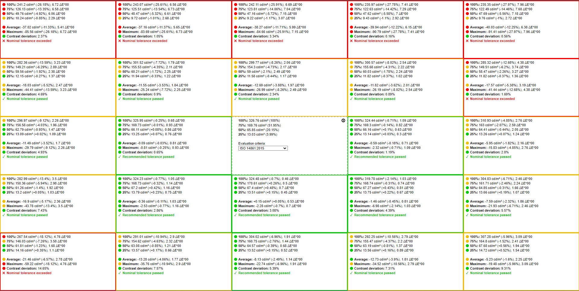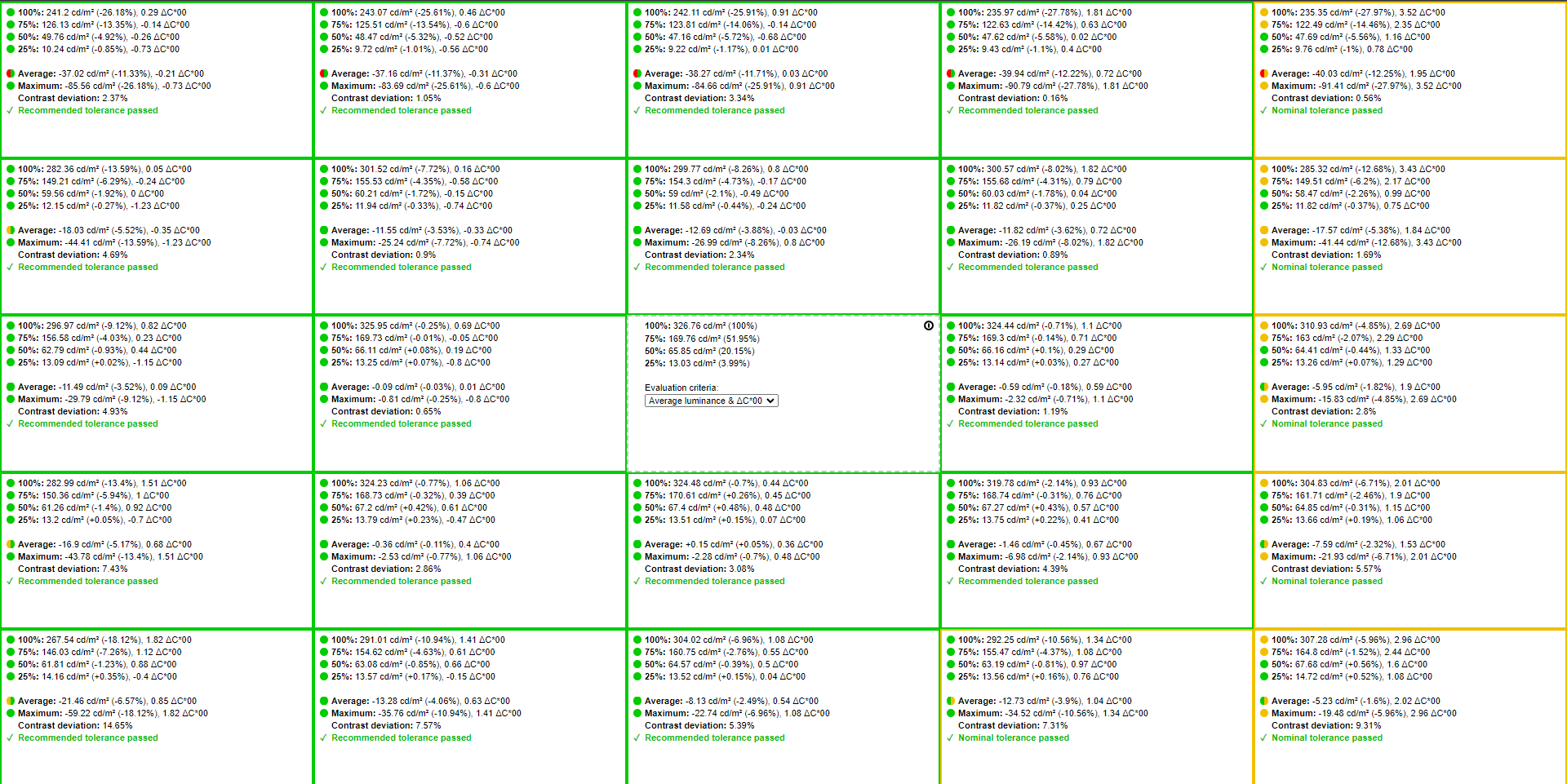 When we look at the DisplayCAL tests, we can see the uniformity across the screen for its color and luminance. This is tested by dividing up the monitor into a 5x5 square and running tests in each of the sectioned off areas and comparing them with the middle of the screen. The Yeyian Sigurd Series 2503 suffered in the delta E comparisons of color difference with large variances at the edges of the screen and more predominantly at the top edge. This was primarily color difference, although there was one section that also had a relatively large contrast deviation too. As for the delta C comparisons of average luminance, you can see we have a generally uniform display, but there is a bit of a drop on the top right corner and continues down the right side. The rest of the areas are within the acceptable 15% difference. Once again, the top edge also has a slightly larger deviance on average, but deviance is typical for more consumer-grade monitors.