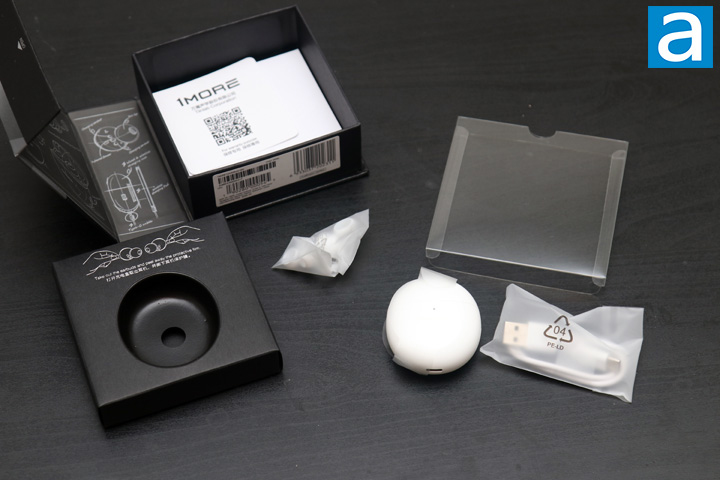 The items inside can be easily accessed by opening up the front flap, which is held closed with a magnet on the side. Behind this is a clear hard plastic cover that shows off the carrying case, which sits in a cardboard box cutout. Inside, we have the 1MORE ComfoBuds Mini True Wireless stored in the charging and carrying case, as well as extra eartips and a short USB Type-C to USB Type-A charging cable. A small manual is also included to help users get started with the ComfoBuds Mini True Wireless.
