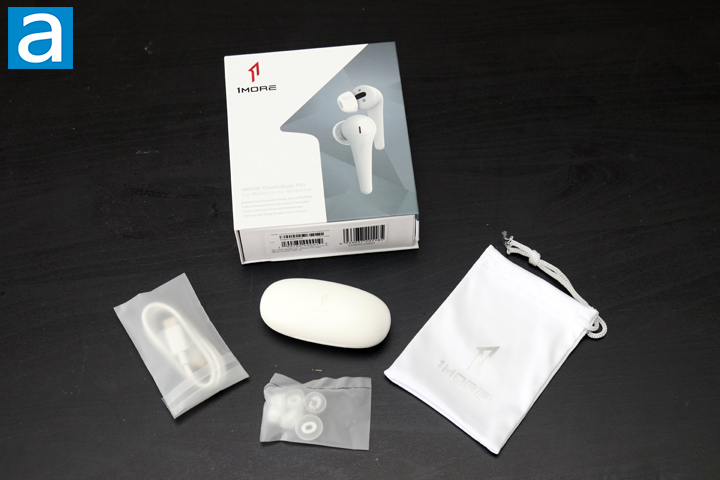To open up the 1MORE ComfoBuds Pro True Wireless retail container, you can flap open the right side and open it like a book. This flap is held with a magnet inside the box. Once inside, the ComfoBuds Pro can be found in the middle of a white plastic shell. Inside the plastic shell box is a small USB Type-C to Type-A cable for charging, small bag containing extra ear tips, and a white fabric carrying case. Some documentation with a 1MORE bear sticker is available that includes a quick start guide and more information in multiple languages.