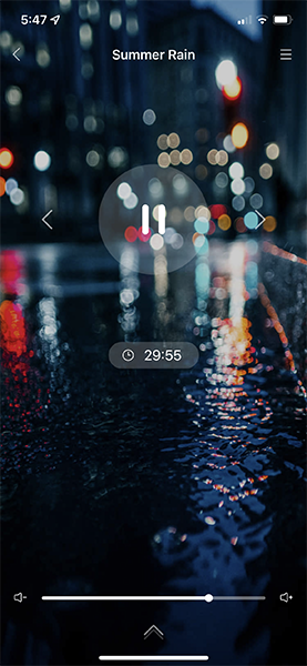 In the main screen, you can switch between the Music and Soothing EQ presets. The Music preset is the default setting, whereas Soothing dampens the lower and upper frequencies to help you calm down. The second screenshot is the Soothing Sounds screen, where you can listen to one of thirty built-in soothing sounds to help you sleep. The soothing sounds can be set to play with a 30, 60-, 90-, 120-, or 150-minute auto-off timer. One interesting feature in the app is the Smart Burn-In feature, where the app will help you automatically burn in your earphones and will take approximately 12 hours.