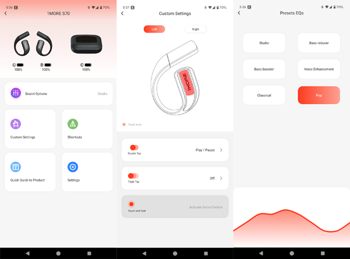 The 1MORE app is available on Android and Apple on their respective app stores. On the top of the main page, the app displays the battery of both the case and earbuds. There are five pages that can be navigated to. In Custom Settings, the touch command functions can be changed. In Sound Options, there is an EQ with six presets, but there is no choice for custom tuning. The Shortcuts page only has one setting option for turning on gaming mode, which is just a low-latency mode. The Quick Guide to the Product page contains exactly what the name suggests. The Settings page has multiple sub-pages. One of the pages allows the firmware to be upgraded. Another one is the Experimental Features page, which has the option to turn on dual-device connection as aforementioned.