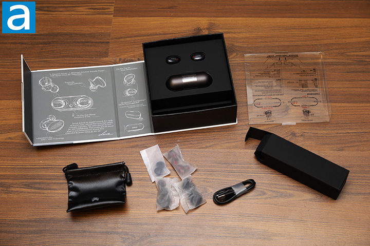 The box can be opened like a book cover, which reveals sketches of the 1MORE True Wireless ANC on the magnetically closed inside flap. You will find everything in various boxes enclosed by a clear plastic cover. The bundle is quite straightforward as well; what you will get are the earbuds themselves, charging case, three additional dome-shaped ear sleeve sizes in addition to the ones already installed, three pairs of cylindrical-shaped ear sleeves in various sizes, two additional O-hooks in addition to the ones already installed, plastic drawstring bag, and a USB Type-C to Type-A cable for charging. The plastic drawstring bag is used to protect the charging case, which is very nice to see it included. Product literature included are a user guide in various languages, warranty card, and a sticker.