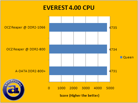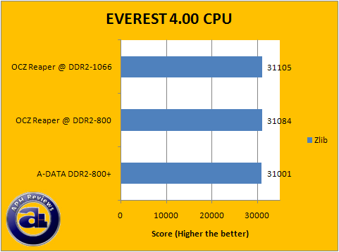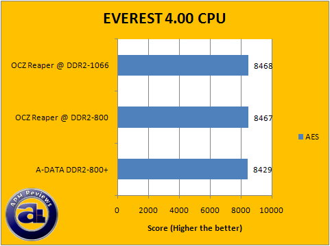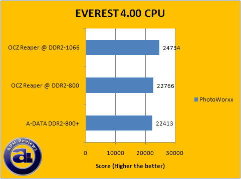 In the majority of our EVEREST CPU tests, A-DATA's Extreme Edition DDR2-800+ RAM performed consistently pretty good but again trails by a few points compared to the OCZ Reaper HPC RAM at PC2-6400 speeds. The percent difference is measured synthetic performance is somewhat similar to what we've previously obtained in the first two benchmark programs; and has been rerun to confirm these test results. Again, it is not going to make an observable difference in real life scenarios -- these results are for references purposes only in performance between different RAM.