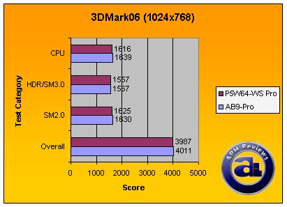 In 3DMark06 running on all stock settings except for resolution (It has been lowered to 1024x768), the abit again outperformed the Asus board in this area. Although not by a significant or considerable margin (Since this is all on-paper stuff along with error margin taken into consideration), this is also reflected by the graphics test in PCMark05; which is developed by the same company.