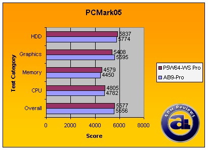The performance of all parts is theoretically identical in our PCMark05 tests, except the Asus P5W64-WS Professional gains a slight performance advantage on paper among nearly all tests, although the difference and error margin is negotiable. It is interesting how the abit outperformed (On paper) the Asus in the graphics area.