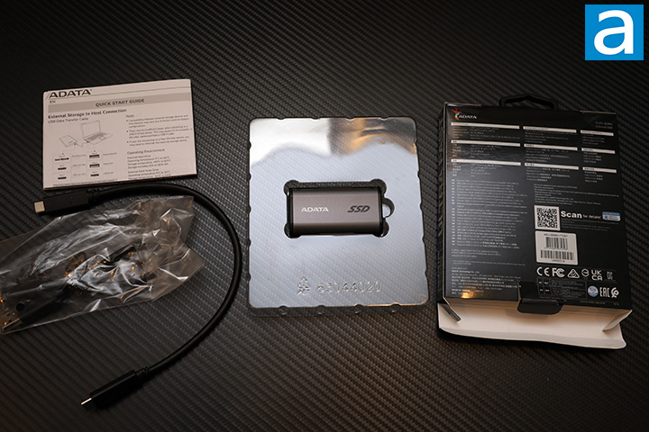 Out of the box, everything is neatly laid out thanks to a clear plastic tray and the fact there is not a whole lot of stuff to begin with. You will receive the ADATA Elite SE880 1TB itself, USB Type-C to USB Type-C cable, USB Type-C to USB Type-A cable, and a multi-language quick start guide. Having both cables included will ensure universal compatibility, which I appreciate. This no-frills approach keeps the retail box small and excess waste low, and I am always appreciative of companies who do not throw in extras for the sake of throwing in extras.