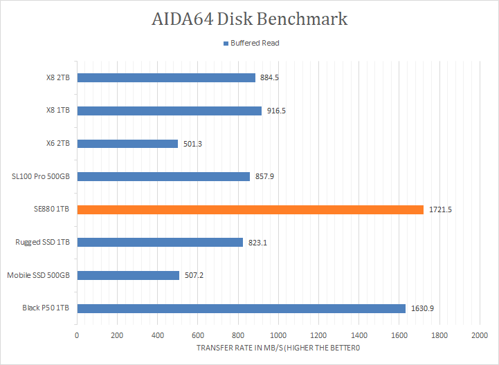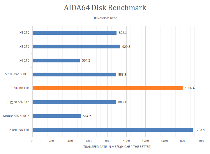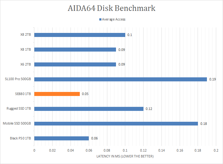 Since our SSD review benchmark results are presented in alphabetical order, first up on the list are results from one of our favorite benchmarking programs, AIDA64 Engineer. Version 6.70.6000, the latest release at press time, can be downloaded from our Downloads page. Just to note, AIDA64 Engineer is a full synthetic benchmark. Unlike full synthetic motor oil, this usually does not always carry a good connotation. While it is not a representation of real-life performance -- such as how fast copying 50,000 photos occur -- it does provide valuable insight into performance between different drives and different controllers. As you can see in our graphs above, the ADATA Elite SE880 1TB's results absolutely dominated all other portable solid state drives other than the USB 3.2 Gen 2x2 Western Digital Black P50 Game Drive SSD 1TB. It scored consistently around the 1500MB/s mark in the linear read segment, making it a clear class above the non-USB 3.2 Gen 2x2 drives. The tested latency was very low with an average of 0.05ms. The rest of the comparison results against all the other drives can be seen in our graphs above.