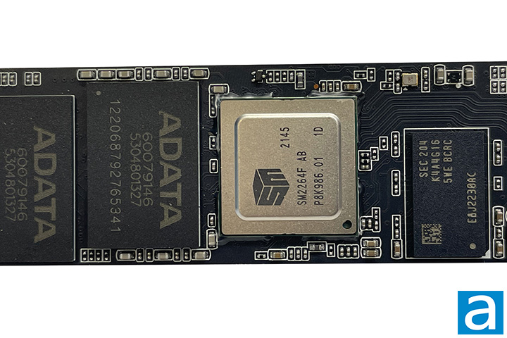 Behind where you would normally put the heatsink, you can see what the ADATA Legend 960 1TB is made from. There are four different components that can be seen. At the heart of ADATA's Legend 960 1TB is a Silicon Motion SM2264. It is an NVMe solution on the M.2 socket to utilize the bandwidth afforded by the PCIe 4.0 standard. The 12nm controller has a quad-core ARM Cortex R8 CPU and features the company's NANDXtend ECC technology and AES 256-bit encryption support. Two Samsung K4A4G165WE-BCRC DDR4-2400 512MB memory chips, one on each side of the PCB, is used by the controller for system memory.