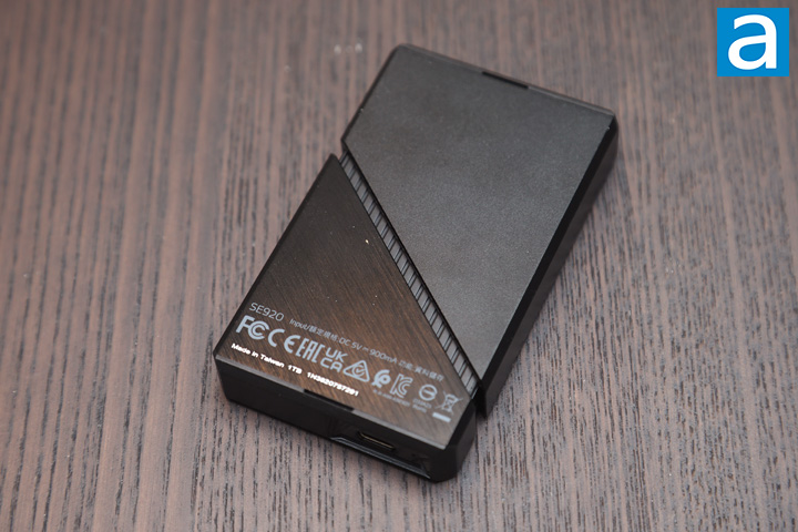 Flipping the drive over, you can get a better look of the other side, which looks very similar to the front. From this photo, you can get a better idea of what the ADATA SE920 1TB looks like when it is closed. The back shows all of the certifications as well as a minimum input of 900mA at 5V. Otherwise, we can also see a "Made in Taiwan" label along with its capacity.