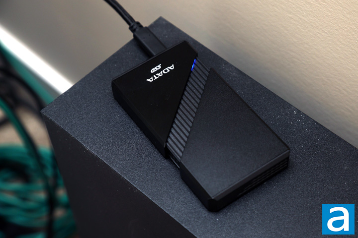 Once the ADATA SE920 1TB is plugged in, you can see the blue LED light turn on for the power status. It would have been nice to see it blink based on drive activity, but we do not have such a luxury here. As mentioned from the specifications, this drive is compatible with Windows, Linux, Mac, and Android operating systems, as well as the PS5 and Xbox Series consoles. Otherwise, with the drive open, you can hear the fan spin out and push air out the top of the sliding cover. There are small holes to allow for airflow. The fan is generally pretty quiet, but you will hear the high-pitched whirring if you are listening for it. As for functionality, I have seen other USB 3.2 Gen 2x2 drives get warmer under testing, so it is no different here with our external USB4 SSD. This is likely part of the fact it is the first drive with these capabilities, but I also hope we will see more passive solutions going forward.