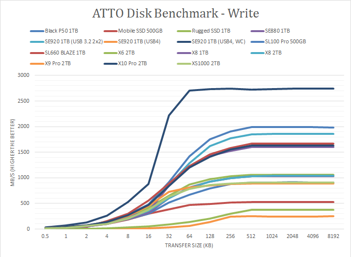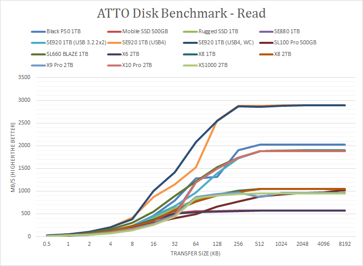 Over USB 3.2 Gen 2x2, the SE920 1TB was still one of the faster drives in our pool of competition. In the write test, it was only second to the WD Black P50 1TB at the larger transfer sizes. Under the curve, the Lexar SL660 BLAZE 1TB was also faster at packet sizes 32KB and under. As for the read test, the ADATA SE920 1TB was close to the SL660 BLAZE and the Crucial X10 Pro 2TB, with similar peak speeds. The SE920 1TB traded blows with these three drives for smaller transfer packet sizes. Even so, I would say the results showed the strong capabilities of the ADATA SE920 1TB.