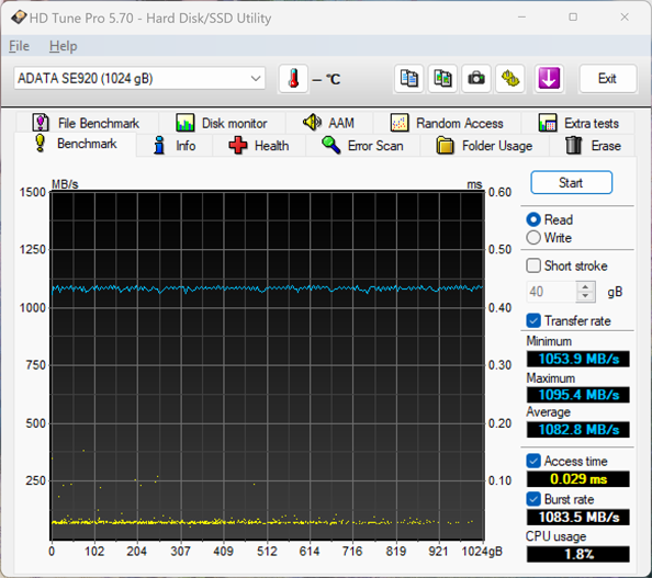 HD Tune Pro is more of a drag race than an indicator of real-life performance, but it provides a good storage performance reference when comparing SSDs with the same controller. HD Tune does not generate any fancy independent graph outputs, so I took a screenshot of the program. For the most part, we have a flat read curve from the ADATA SE920 1TB, which is a positive sign. Once again, we have three graphs for USB4 via Thunderbolt 4, USB4 with write caching enabled, and USB 3.2 Gen 2x2. Its average 1082.8MB/s was again the fastest drive we have seen yet. Over USB 3.2 Gen 2x2, we had an average of 612.1MB/s, which was faster than both the ADATA Elite SE880 1TB and Western Digital P50 Game Drive SSD 1TB, which had results of 608.5MB/s and 588.7MB/s, respectively. At the end of the day, HD Tune may not be the best way to compare solid state drives, but the results provide a different insight from the other tests.