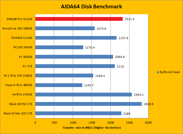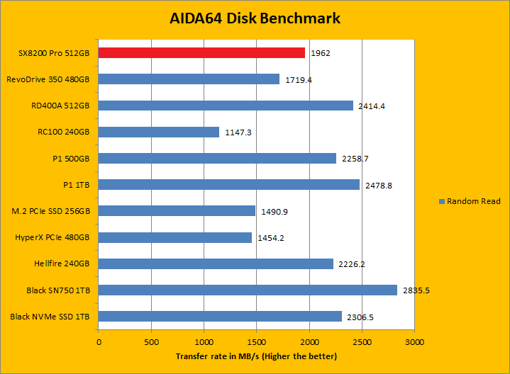 Since our SSD review benchmark results are presented in alphabetical order, first up on the list are results from one of our favorite benchmarking programs, AIDA64 Engineer. Just to note, AIDA64 Engineer is a full synthetic benchmark. Unlike full synthetic motor oil, this usually does not always carry a good connotation. While it is not a representation of real life performance -- such as how fast Photoshop opens -- it does provide valuable insight into performance between different drives and different controllers. As you can see in our graphs above, the ADATA XPG SX8200 Pro 512GB scored about mid-pack; averaging around 1660MB/s for linear read. The rest of the comparison results against all the other drives can be seen in our graphs above.