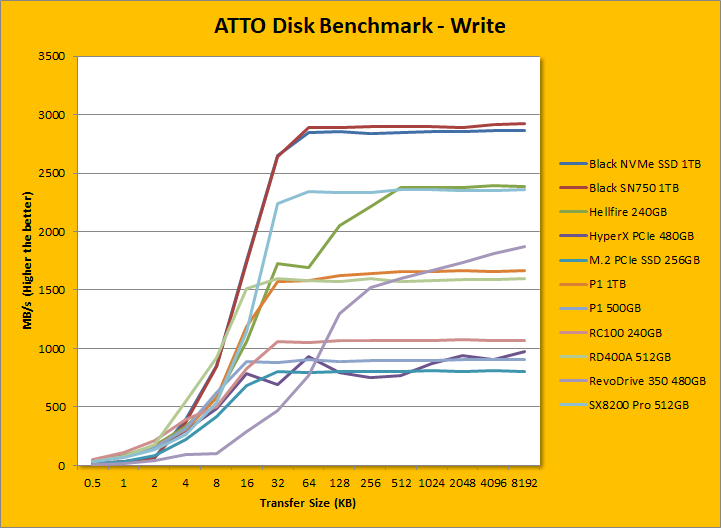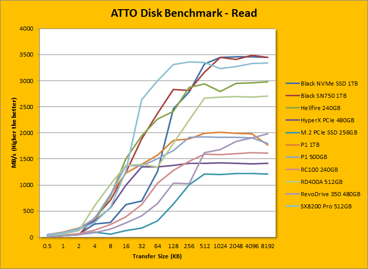 Following up next are our usual ATTO read and write tests. ATTO is an often-quoted benchmark, because it is easy to use and accurate. For the most part, it is a favorite among reviewers, and I have grown to embrace it as much as the next for the last little while. ATTO uses easily compressible data, so compression-heavy controllers will perform very well here; as far as the Silicon Motion controller is concerned -- well, here are our results. As manufacturer peak read and write performance ratings can usually be achieved using ATTO besides Crystal Disk Mark, whether a drive lives up to its marketing claims or not can be validated by this program. ADATA claims the XPG SX8200 Pro 512GB's maximum read and maximum write are pinned at 3500MB/s and 2300MB/s, respectively. According to our tests, these numbers were close. It peaked at 3338.749MB/s read and 2356.994MB/s write. Under the curve, its write speed was comparable to the Hellfire M.2 until 16K, where it was only passed by the pair of Western Digital Blacks. We can see a similar pattern as we move into the read graph, except the Hellfire held on until 16K. Between 32K and 512K, the ADATA XPG SX8200 Pro 512GB was the fastest SSD in ATTO we have ever tested here at APH Networks. The lead was not given up until 1024K and above.