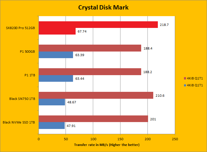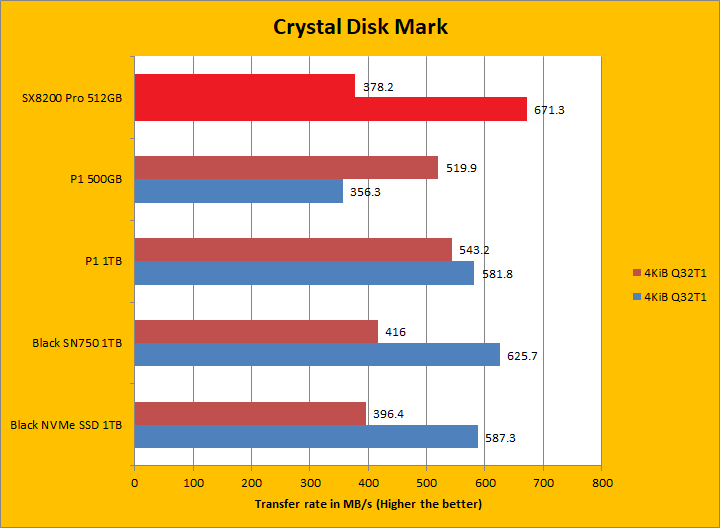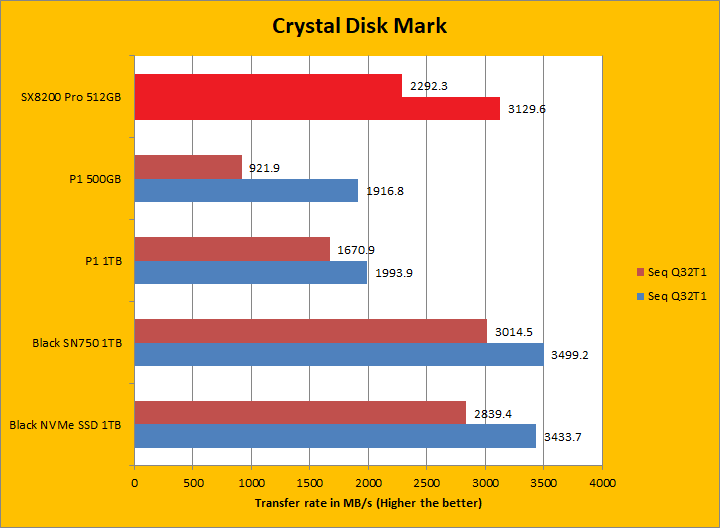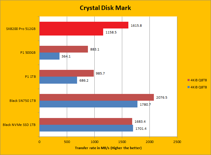 Crystal Disk Mark 6.0 is in the spotlight. Just a bit of background information; higher capacity drives tend to perform a little better in these tests. The ability of a controller and flash memory to deliver high IOPS will provide huge benefits to the score as well. The ADATA XPG SX8200 Pro 512GB is rated at up to an impressive 390,000 IOPS read and 380,000 IOPS write. Looking at the read and write results of all four sections, the XPG SX8200 Pro came in behind the more expensive Black NVMe SSDs in the sequential, 4KiB Q8T8, and 4KiB Q32T1 write tests, but took first place in the 4KiB Q1T1 tests. When it came to read, the story was similar. It came in third in the sequential and 4KiB Q8T8 tests, but ranked first in the 4KiB Q32T1 and 4KiB Q1T1 tests. I will let you make your own comparisons in our list of SSDs in the graphs above.