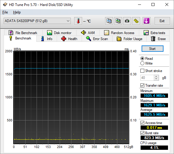 Unfortunately, HD Tune does not generate any fancy independent graph outputs in particular, so I just took a screenshot of the program. The ADATA XPG SX8200 Pro 512GB remained very flat on average. It differed slightly in magnitude than HD Tach -- probably due to testing algorithms used -- but its performance characteristics were identical in practice. Other than that, the results were top tier across the range; the recorded access time was very low, as we would expect from a solid state drive. The XPG SX8200 Pro posted an average of 1625.5MB/s for its sequential read speed, which is faster than the Western Digital Black NVMe SSD 1TB at 1508.9MB/s. Do keep in mind the discussion we had on the previous page, as it still applies here.