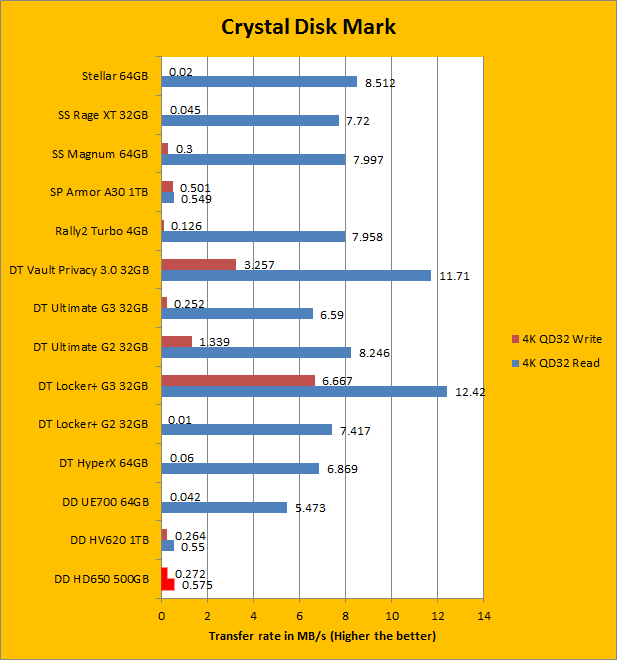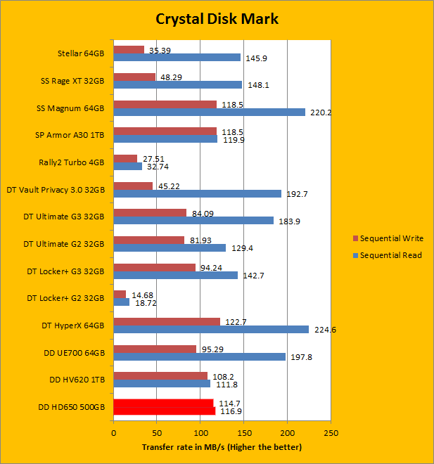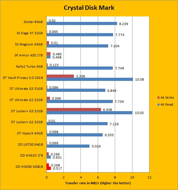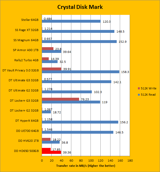 The ADATA DashDrive Durable HD650 500GB has performed well so far in our tests, and now we move to our Crystal Disk Mark sequential read and write results. As you can see from the graph, the results are as we expect from the HD650. Of course, shifting to the next graph, we can see the difficulty of the 512K write tests, and its ability to destroy every USB 3.0 flash drive, with the exception of the Kingston DataTraveler Locker+ G3 32GB. Unfortunately it is the same for the portable hard drives, as all of them see quite a drop in both write and read performance numbers. Moving to the 4K and 4K QD32 domain, which tests for input/output operations per second (Commonly referred to as IOPS), the DashDrive Durable HD650 is ranked where we expect it to be, which is near the bottom. Traditionally USB flash drives have been weak in this area, but our more recent Kingston flash drives like the DataTraveler Vault Privacy 3.0 32GB and the aforementioned Locker+ G3 are proving otherwise. Once again for most of the tests, the HD650 is slightly better than the past ADATA portable hard drive, which is good to see no matter how small the improvement. The Silicon Power Armor A30 1TB is also faster in practically all the tests, for both read and write, and continues its very small lead in speed.
