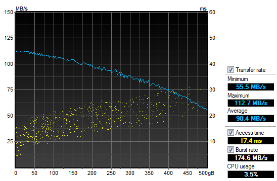 As you have seen in the past, HD Tune does not provide us with pretty independent graph outputs, and so I had to edit our screenshot to make it more suitable for publishing in a review. Again, we see a similar curve as reflected in the previous HD Tach graph. Numbers are a bit lower in magnitude, probably due to differing algorithms used, but the characteristics are similar in practice. The average works out to around 90.4MB/s, with a maximum peak of 112.7MB/s and a minimum of 55.5 MB/s. The latency of 17.4ms once again lines up with our past results in AIDA64 and HD Tach.