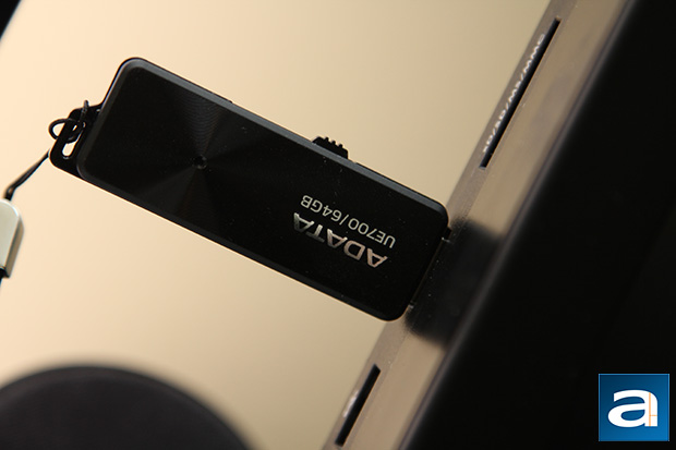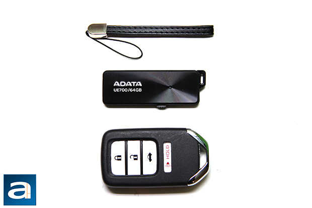 A quick glance at the specifications table pits this portable storage device at 65mm long, 21mm wide, and 7mm thick. Compared against its the competition, such as the Patriot Supersonic Magnum 64GB at 78mm long, 27mm wide, and 7mm thick, the ADATA DashDrive Elite UE700 64GB is definitely quite a bit sleeker. Our photo above compares it against an automobile smart key. It also tips the scales at only 11g, which is significantly lighter than the chunky DataTraveler Ultimate 3.0 at 32g. I don't know how much the Patriot Supersonic Magnum weighs, but the ADATA DashDrive is definitely lighter by my ever-so-reliable hand scale.